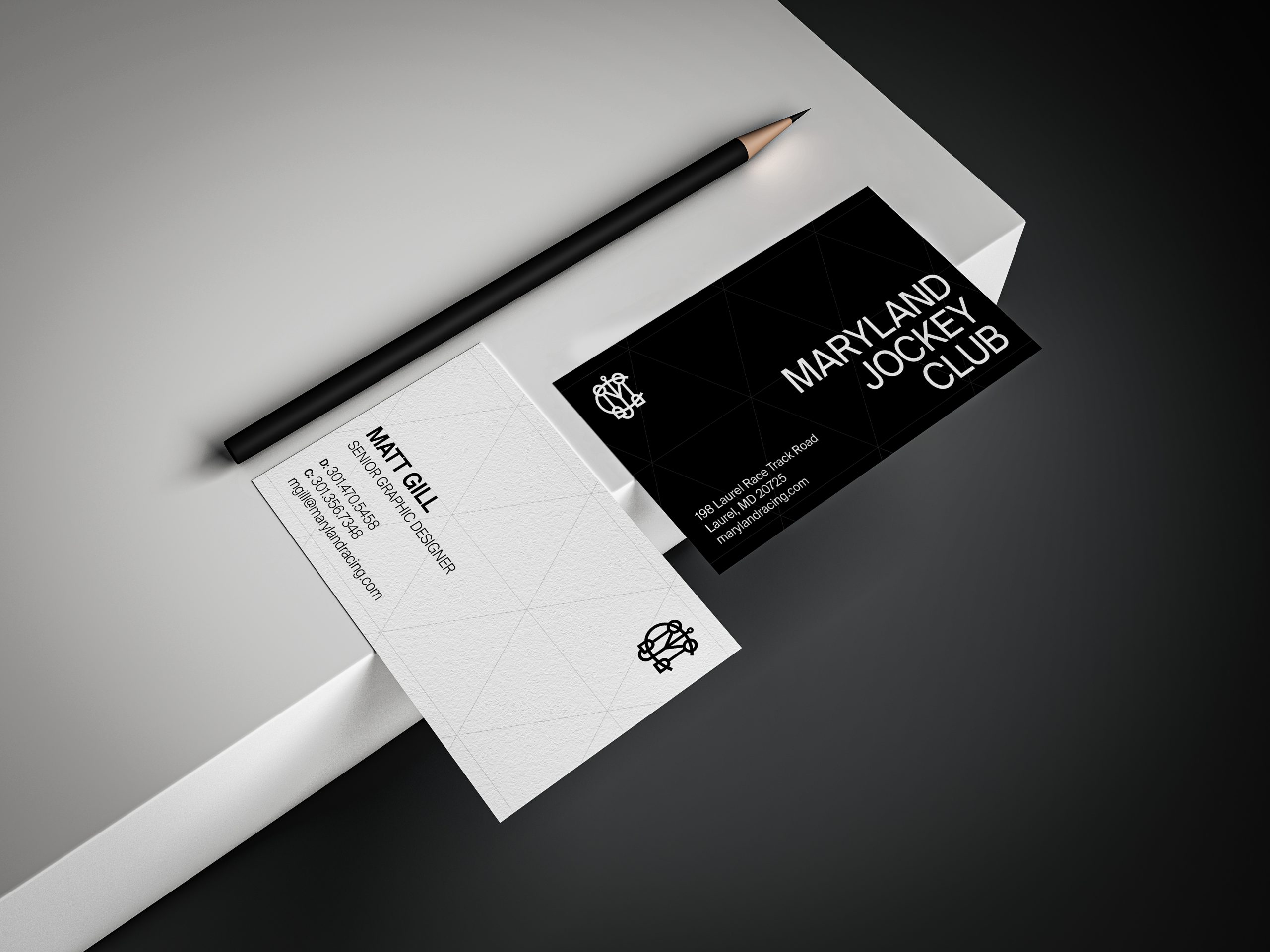 A new brand demands fresh marketing material. The Maryland Jockey Club’s business cards needed something with style that could represent their newly established class. Several variations were produced and this was the winning concept.